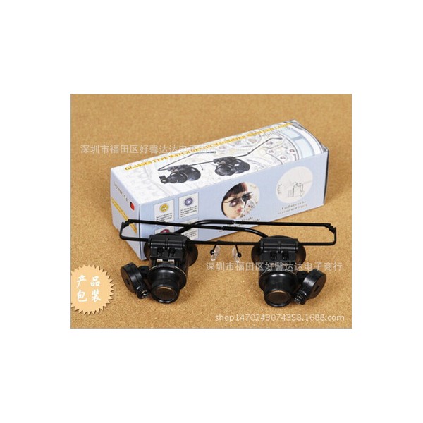 бинокулярная лупа-очки с 20-кратным увеличением, с изменяемым углом наклона каждой из двух луп и наличию двух ярких светодиодов с регулируемым углом освещения